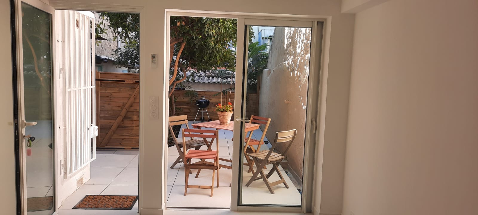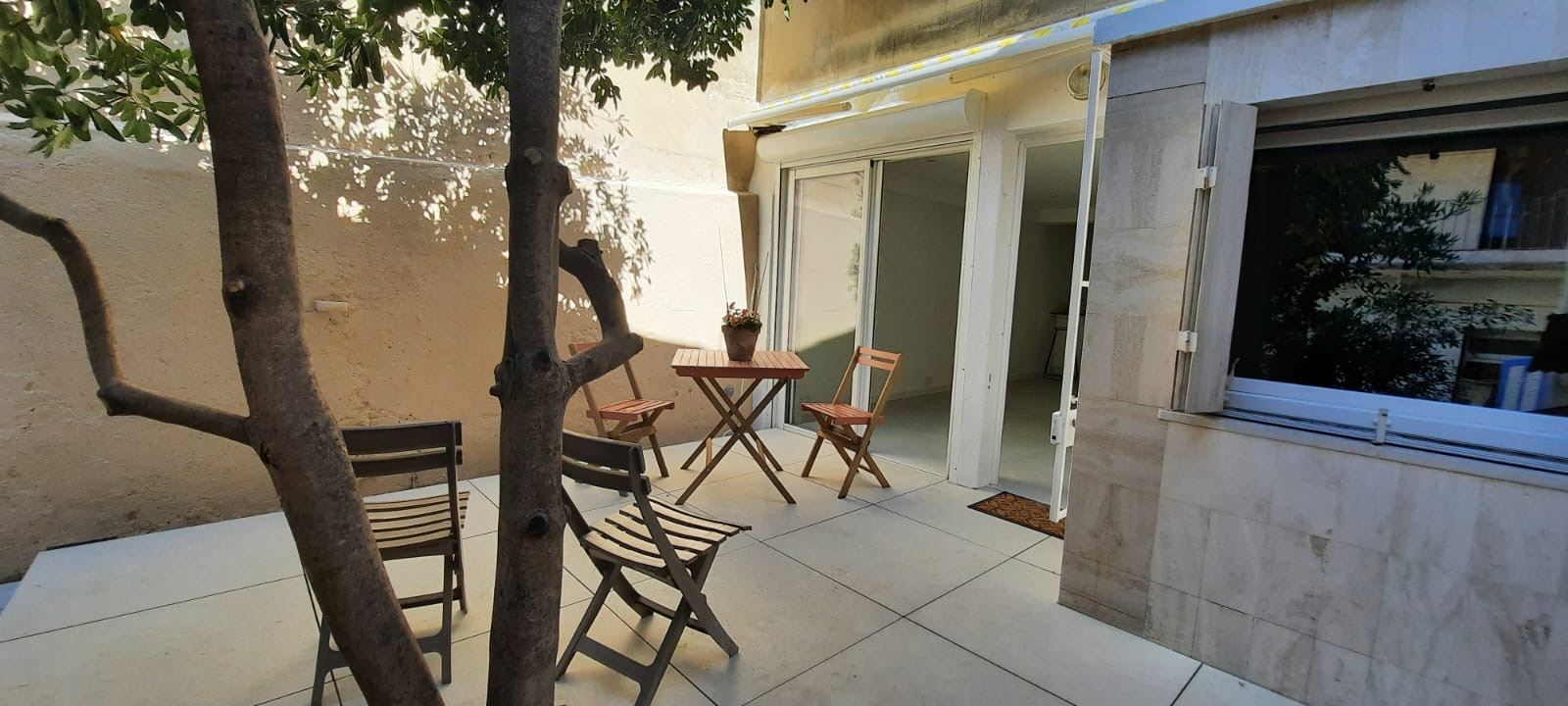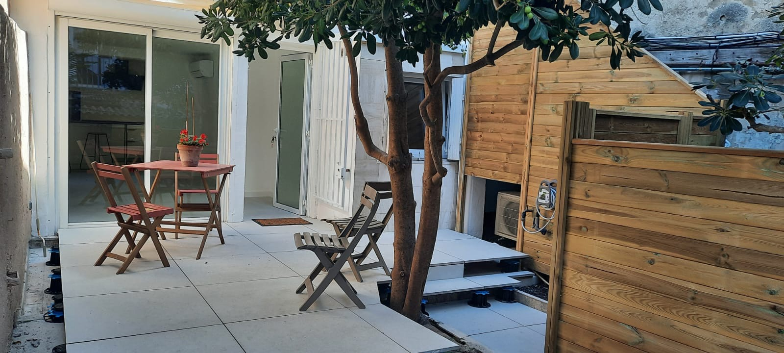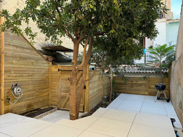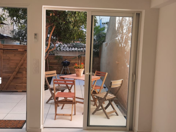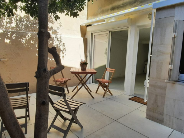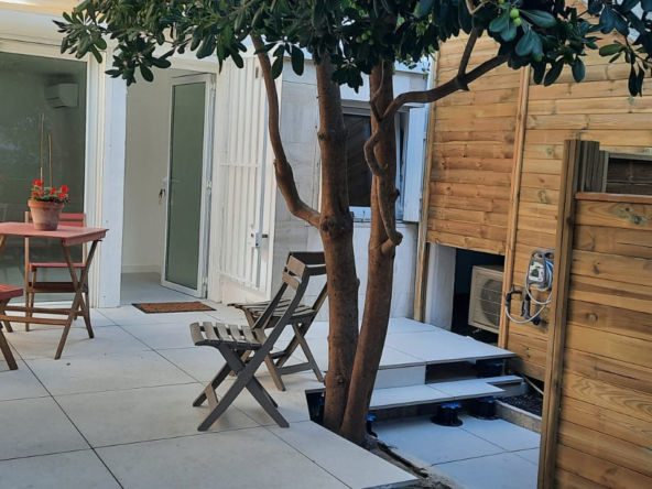 je vous propose une bombonière de 2 pièces en RDC calme avec belle terrasse de 28 m2 dans de l ‘ancien entièrement refait neuf climatisé et tout équipé moderne , cuisine et bains neufs une chambre parqueté avec coin dressing salle d’eau et wc séparé. Une dépendance complète ce bien.