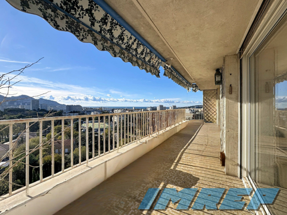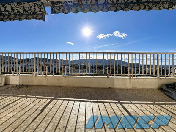 Le salon de 45 m², accompagné de sa cheminée, déroule ses mètres carrés comme une invitation à recevoir, qui profite d’une vue panoramique mer et ville depuis la terrasse de 16 m².
